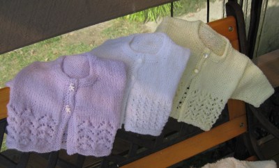 These 3 are a group of 0 -3 month old jackets worked from a pattern found on the internet but an easy one to actually come up with yourself. Skirt is all in one piece, divide for fronts and back, sleeves set in down to the start of the opening, then pick up neck and after that pick up along the fronts.