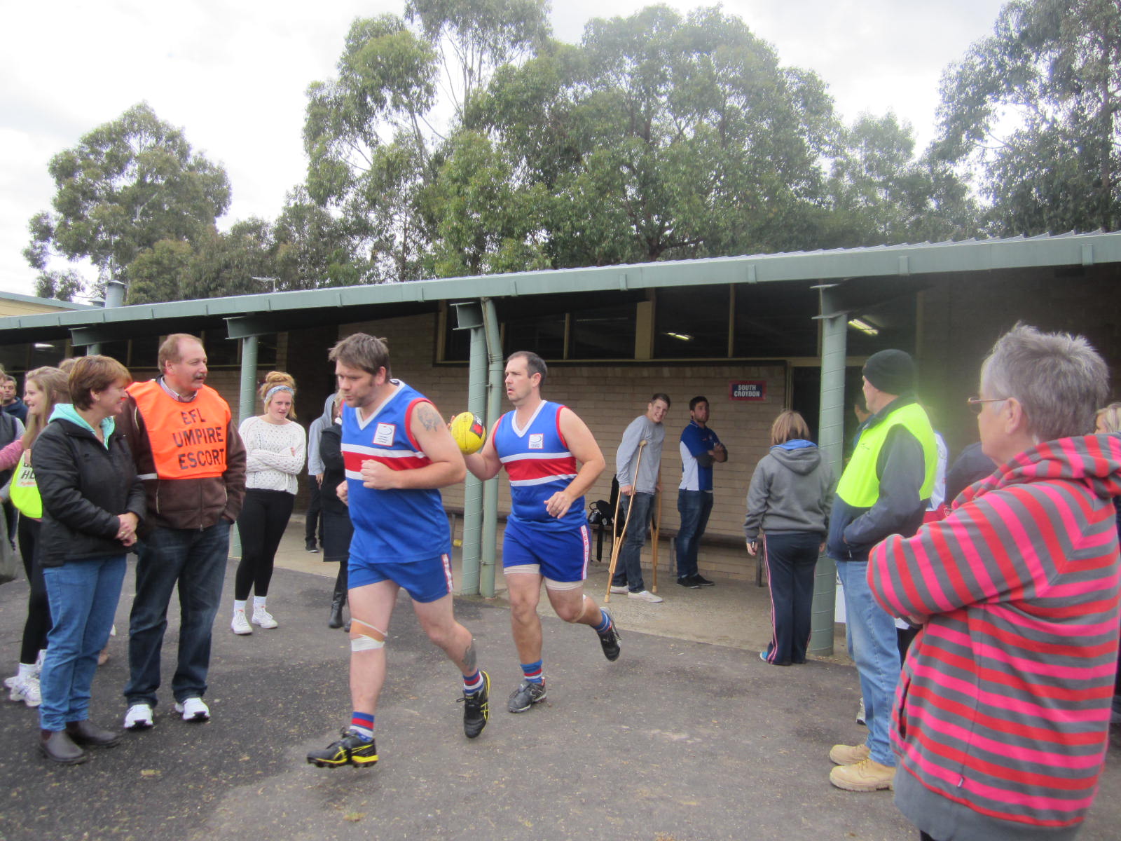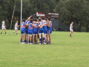 Teams are on the ground and even tho’ they have had lots of encouragement in the team rooms there has to be an onground huddle to start them in the right frame of mind followed by another pre game warm up exercise And then the umpires are escorted on to the oval – a sign of the times that even for junior games the umpires are escorted on and off.