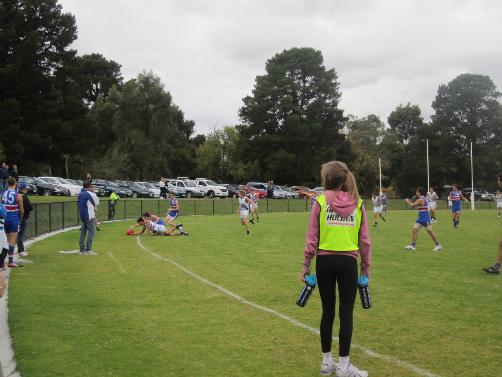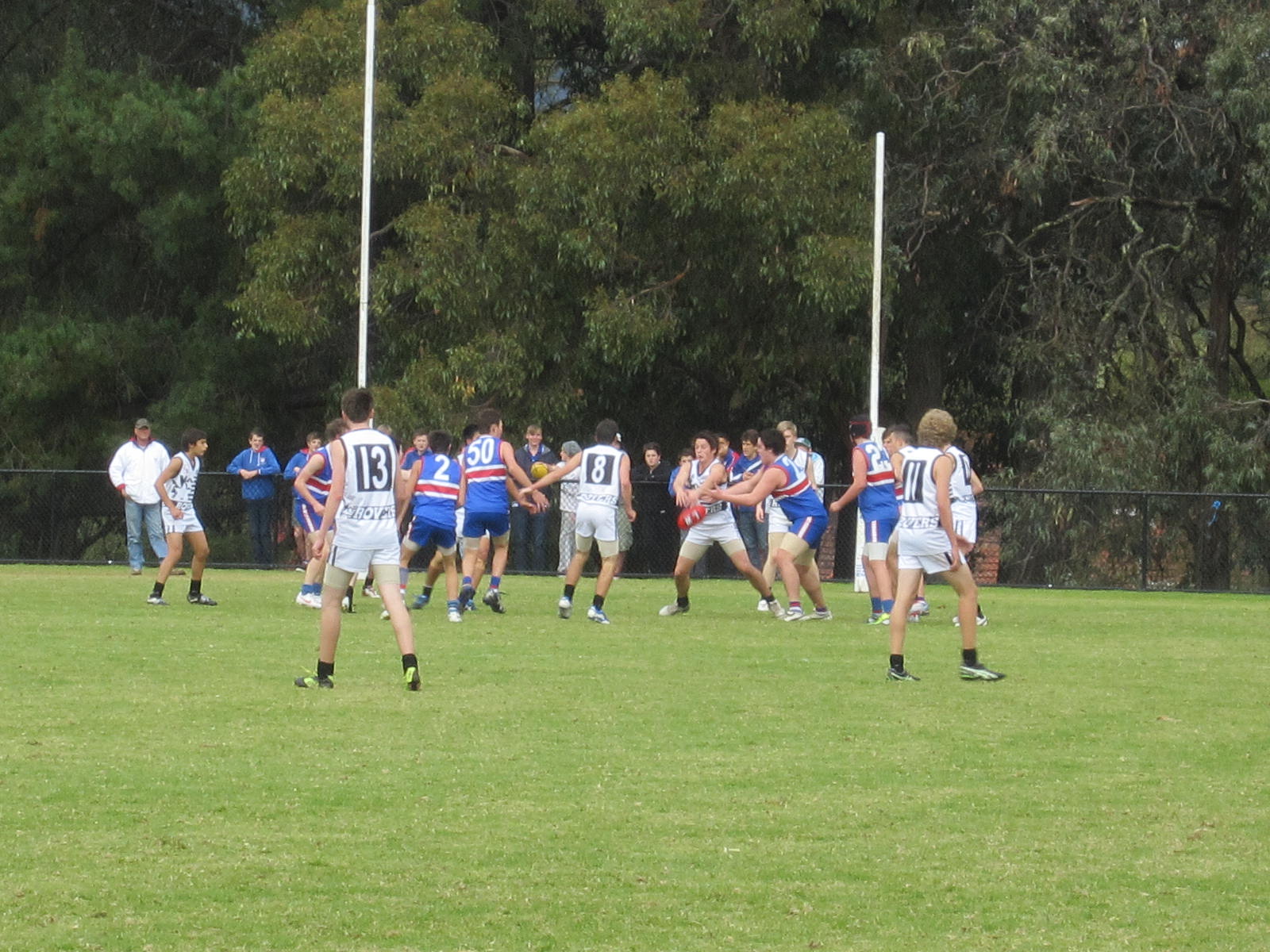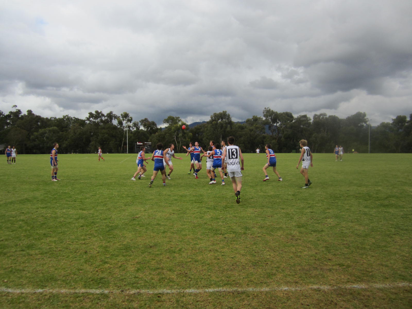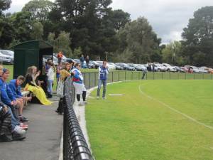 So with a ball up the game is started – ball up and not centre bounce because the ground was rather soggy and wet . Out our way trees and perimeter parking are one of the great things about most local football ovals – shade in the summer when its cricket thats played here and if you really need it warmth to watch the footy in the winter on a cold rainy day.  Plus the advantage of being able to toot the horn when a goal is scored lol This ground is within sight of those hills I keep talking about and if you look carefully the TV masts are visible just in the centre