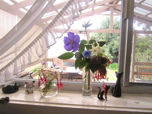 The purple flowers just helped lift the little arrangement of lonesome blooms on the window sill. Rummaging around I found those little daffodil flowers I spoke of before, some more of the tiny fuschias, some tiny lavender colour Brachycome flowers, a single blue cornflower that appeared from nowhere and some of the long blooms from the Salmon coloured Tryphylla Fuschia thats tucked away out of direct view in another corner of the garden