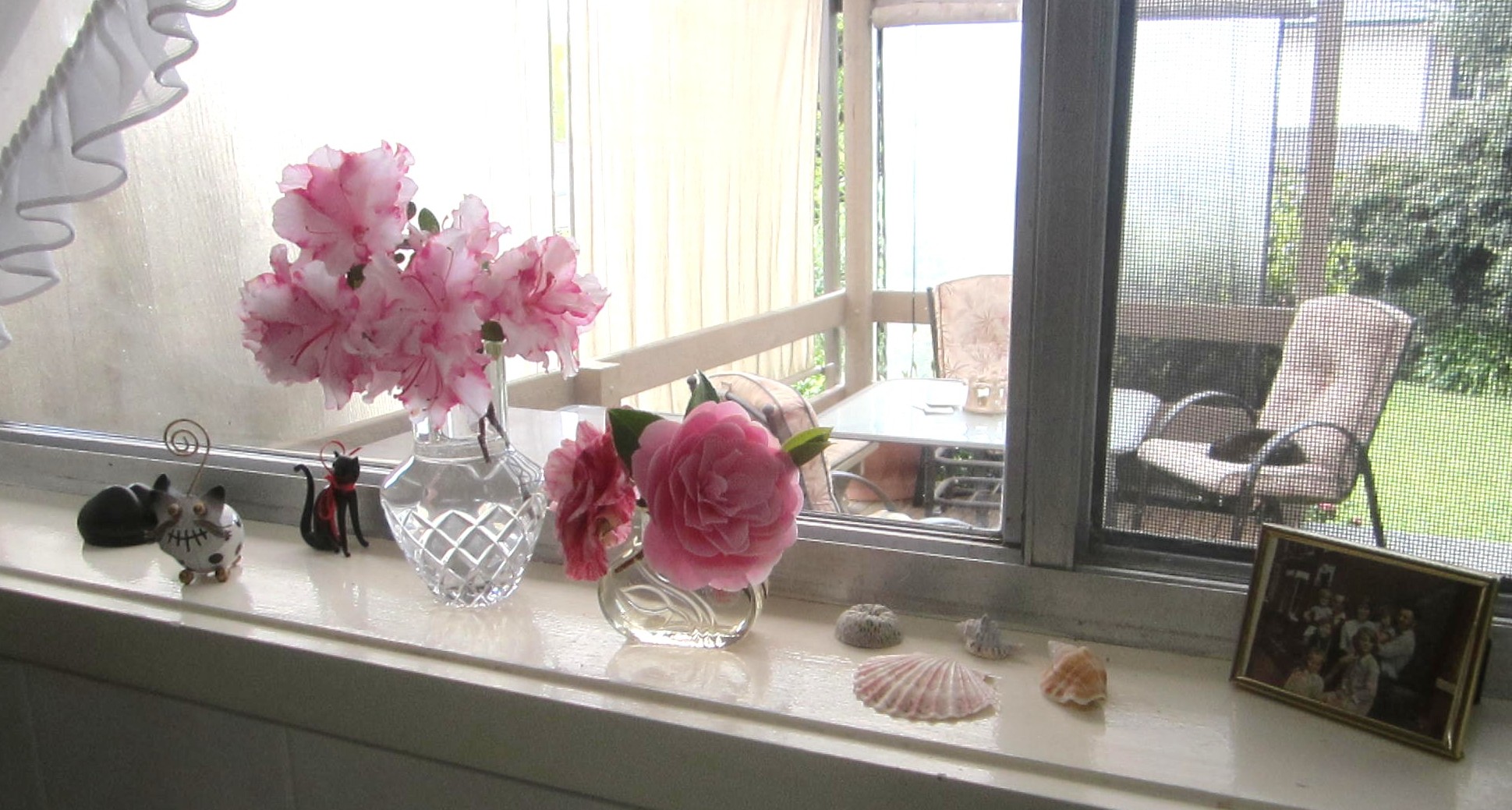 Clean kitchen windows meant fresh flowers were needed for the window sill – sadly there aren’t a lot to choose from at the moment. The constant winter and spring rains have made the Azaleas all mushy and the majority of the Camelias seemed to have dropped quickly but those that stayed for the game are all brown round the edges.