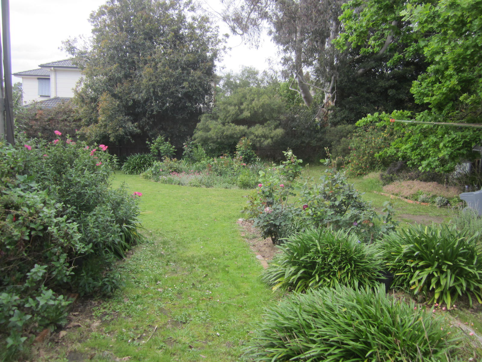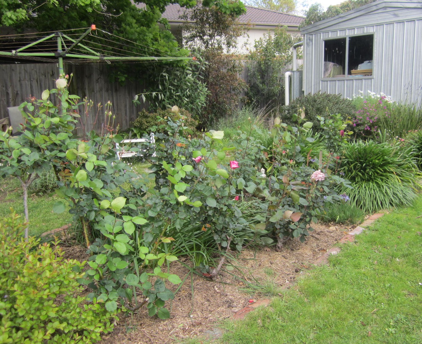 Everything is so green – so very different to when we left in late August. There are leaves on all the trees who shed them including next door’s big oak tree and the some of the roses are actually blooming. The foliage of the winter bulbs is hidden by the rose foliage – which means they can rest and die down peacefully till spring next year.