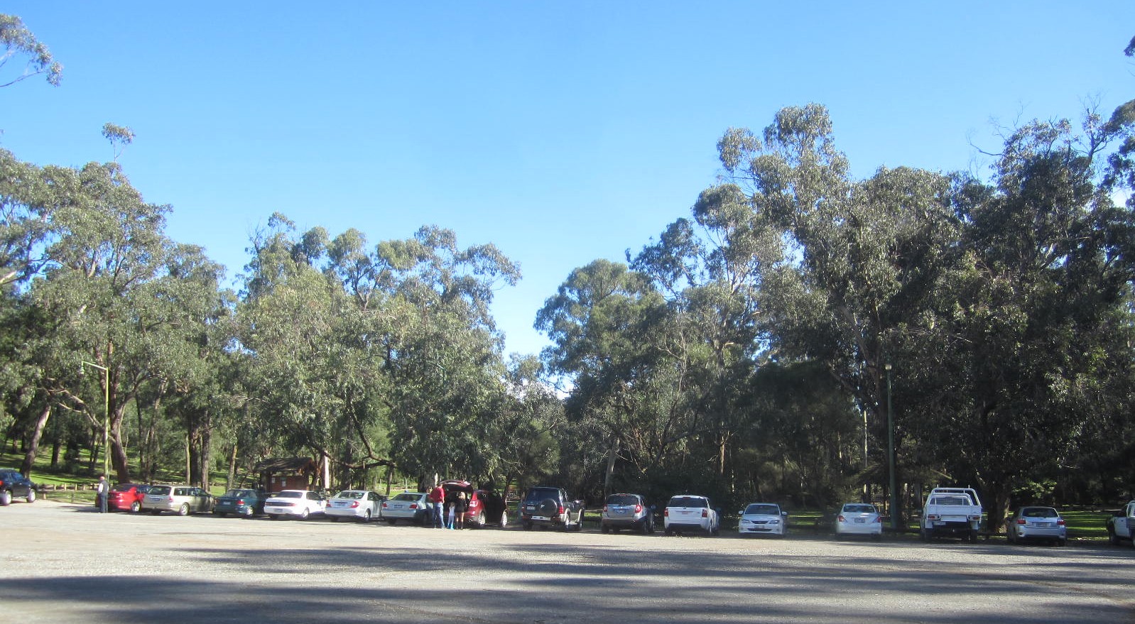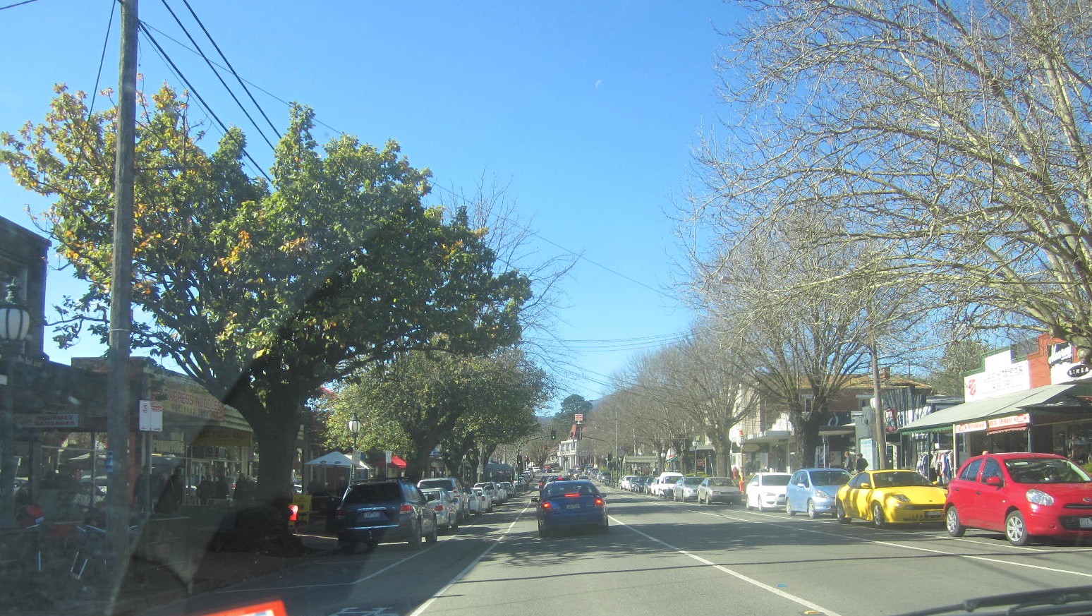 Through the busy little town of Healesville, set in the foothille of the Great Dividing Range, busy on a Sunday same as any day, but see the trees are bare on one side of the street but not the other – must have a different micro climate. More sun more shade??