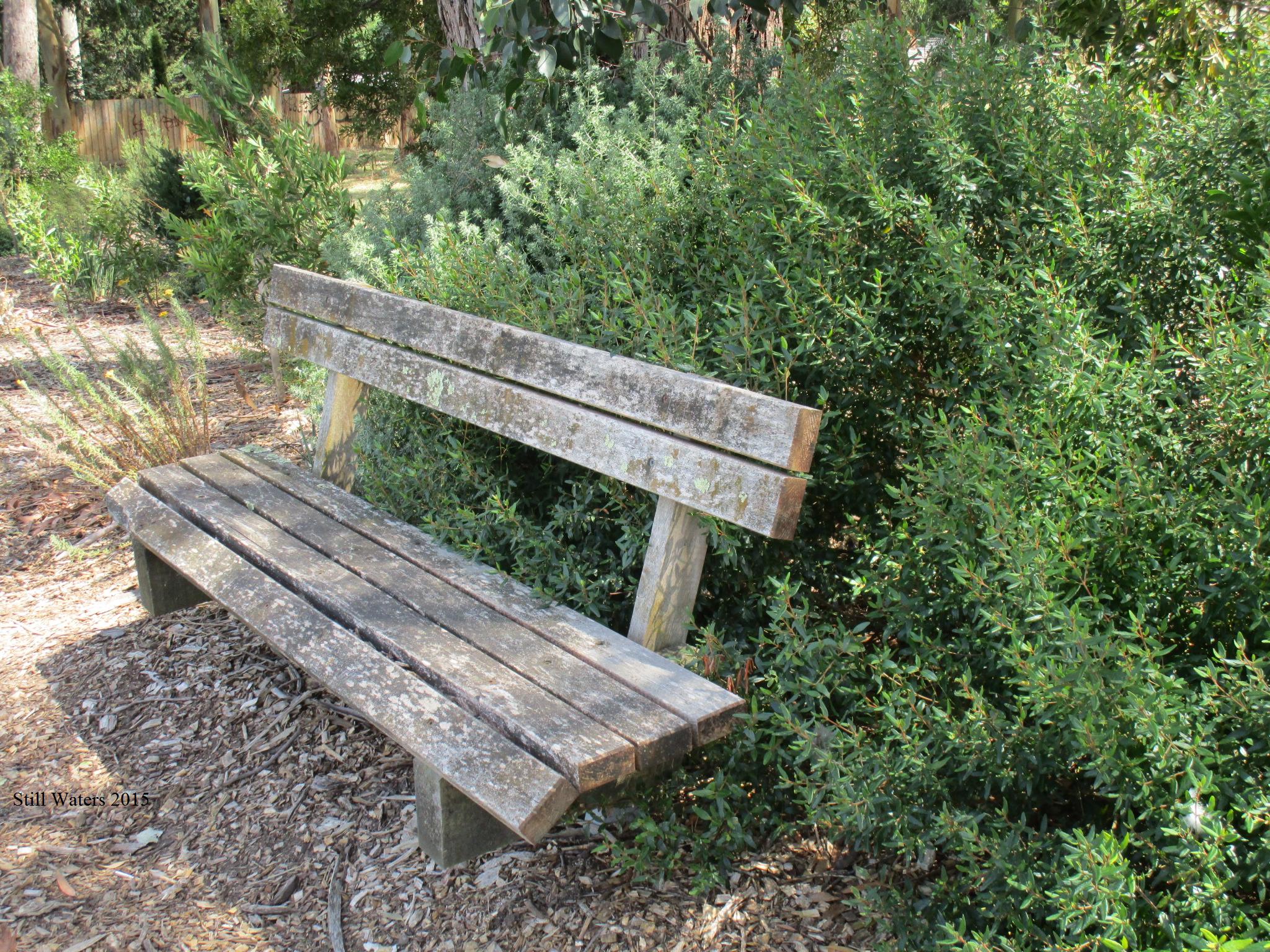 Now there can be times during these walks (especially if it’s warm) when I’m feeling out of sorts (also referred to as being a bit puffed and out of breath:)) so I use this bench to gather my thoughts. Â It’s just a simple wooden bench placed very conveniently beside one of the pathways in a park, it’s a place for me to sit and watch and wonder. Â Nestled just off the path – close to a small stand of established trees and in front of what were new plantings – it is the bench I featured earlier this month in a black and white bench post.