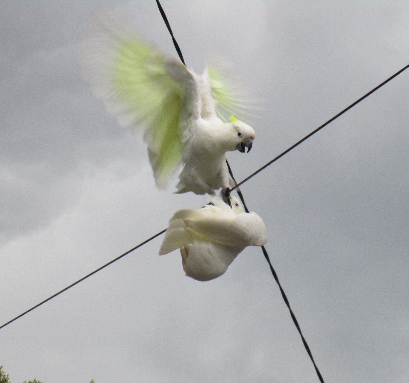 I thought I was back in those days listening to my small sons bickering when I heard these two Cockatoos having ‘words with each other’ on the power lines the other day