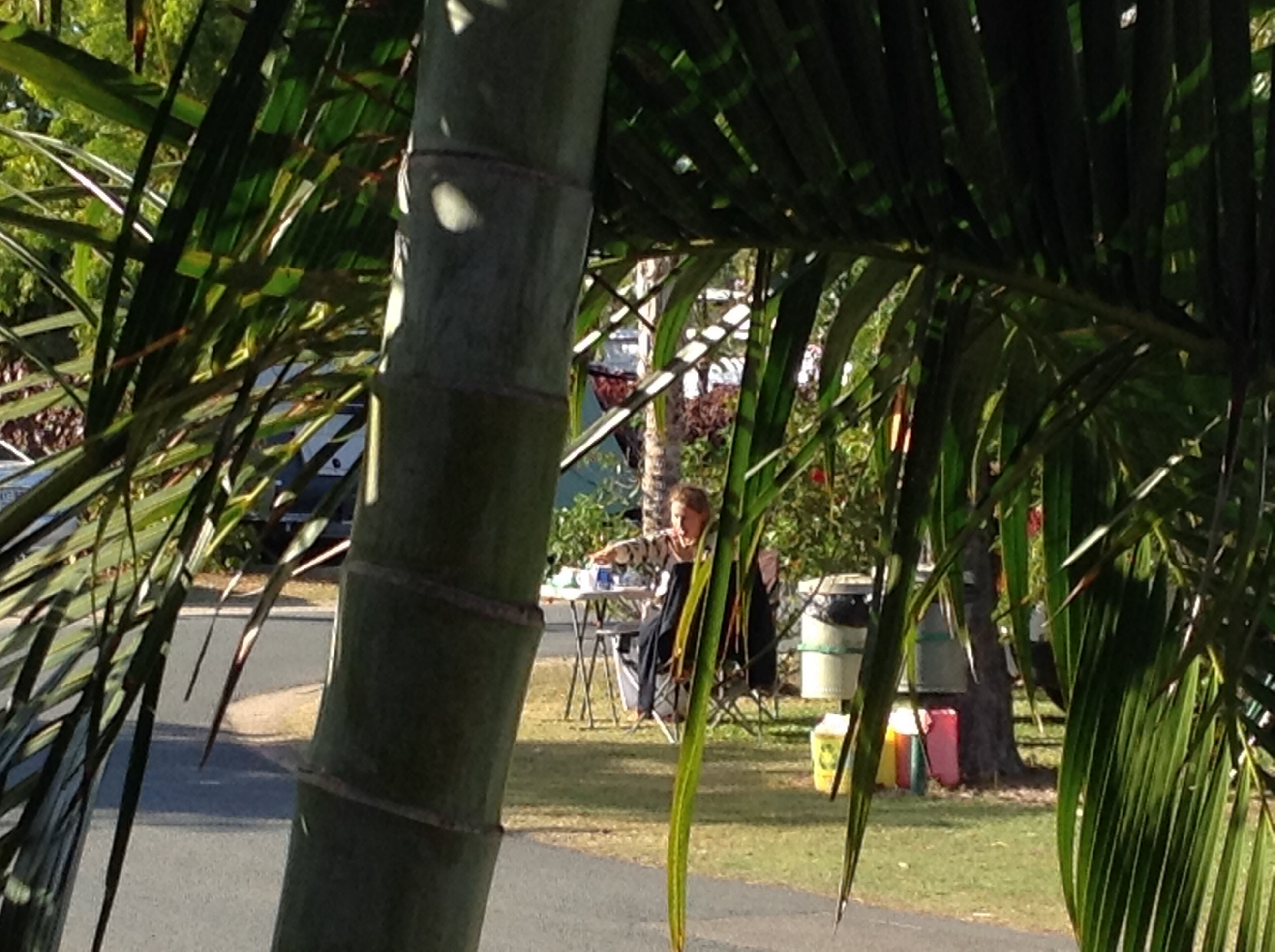 There is a young couple camped just down the way from us – not tent camping but in one of those trailer affairs that unfolds into a tent.  When I went outside first thing this morning I noticed the young girl setting up a table – next thing she pops a small cloth on and proceeds to set the table for breakfast. Nothing unusual about that – things look so quiet and peaceful (and safe in the knowledge I wouldn’t be seen) I just had to snap her as she was pouring a cup of tea.  Oblivious to all the others parked around her she really was enjoying her breakfast.