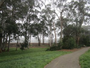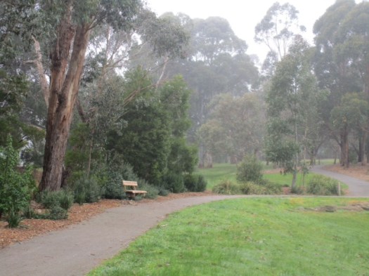 So it was up the hill past the old school oval which is now an off lead dog park – couldn’t see or hear anyone. Â Nobody around but me. Â And looky here – there’s my resting spot. Â If you compare this photo with the one of the masthead you can see how much growth has taken place in not very many years. Â It’s a lovely place to sit and watch the world go by on a warm dry day. Â Not today tho’!