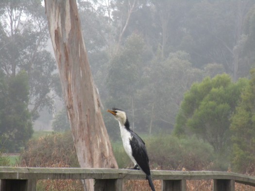 A big black and white bird was perched on the railing. Â I’d no idea what it was.