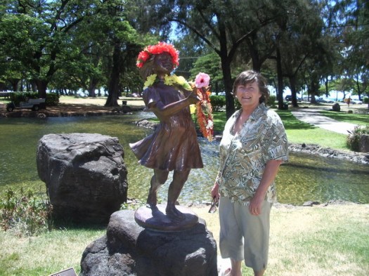 Joy, as she’s called is dedicated to the children of Hawaii……..She really did look happy……as children should….with her donated leis on her head and in her arms. Me….I just looked hot – hot and sticky 🙂