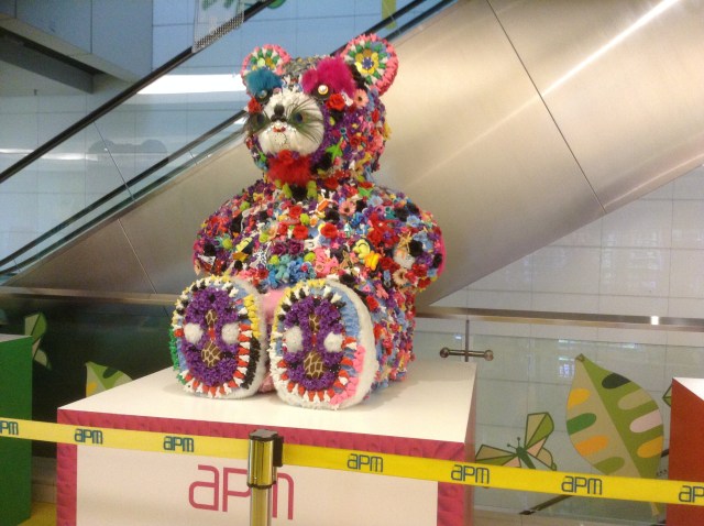 Beside the escalators in the big ‘open all hours’ apm shopping centre Hong Kong