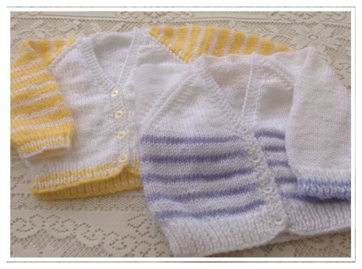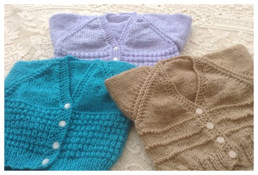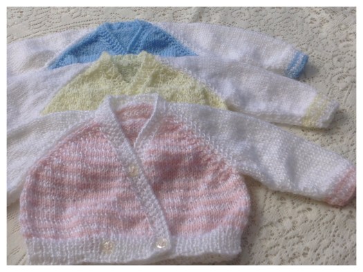 I decided to concentrate on small woollies this year (newborn- 6months), took just two of my basic patterns with me, some white, some solids plus a lot of small balls of this and that…..and came up with 10 little baby cardigans.