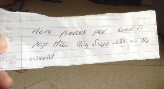 3. I find phone numbers and names jotted on scraps of paper that I have no idea about! I was wondering whether the note refers to the Piano Mill project here in Qld, near Stanthorpe?? That quote about piano ownership is used in their blurb.
