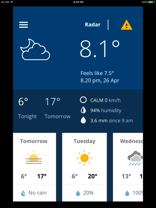 Posted on April 27, 2020Walkies anyone…. Last night’s forecast Cool nights – pleasant days Good for walking! Don’t think I’ll be going anywhere on Wednesday though ☔️ Like Loading...