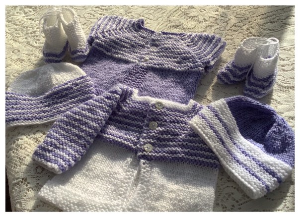 Decision made, I set to and came up with a couple of very easy to knit newborn jackets in different colour ways to put together with the hat and bootees. On reflection they do look a bit dark so I’ll leave it up to the charity to decide what will go with what….they may have some things in paler colours to team with them and soften the look.