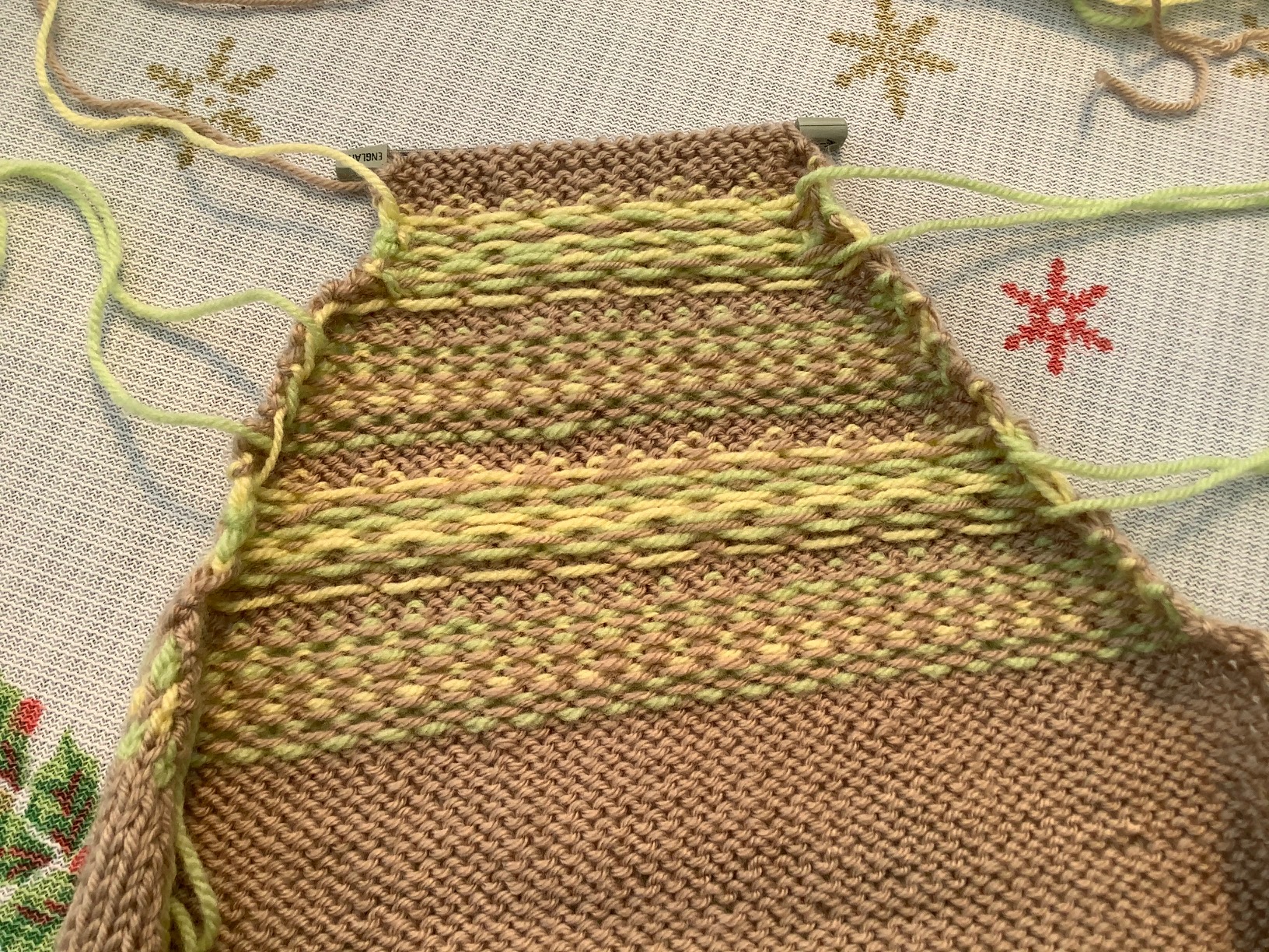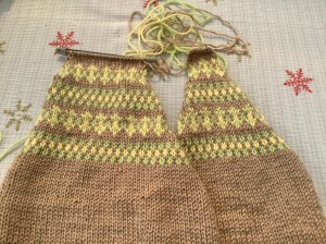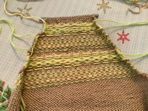 Looking at the wrong side you can see that like traditional fair isle there’s only two colours to each row, short breaks between each colour meaning short strands. And I tried to have the same colour on the top as I went along the row.