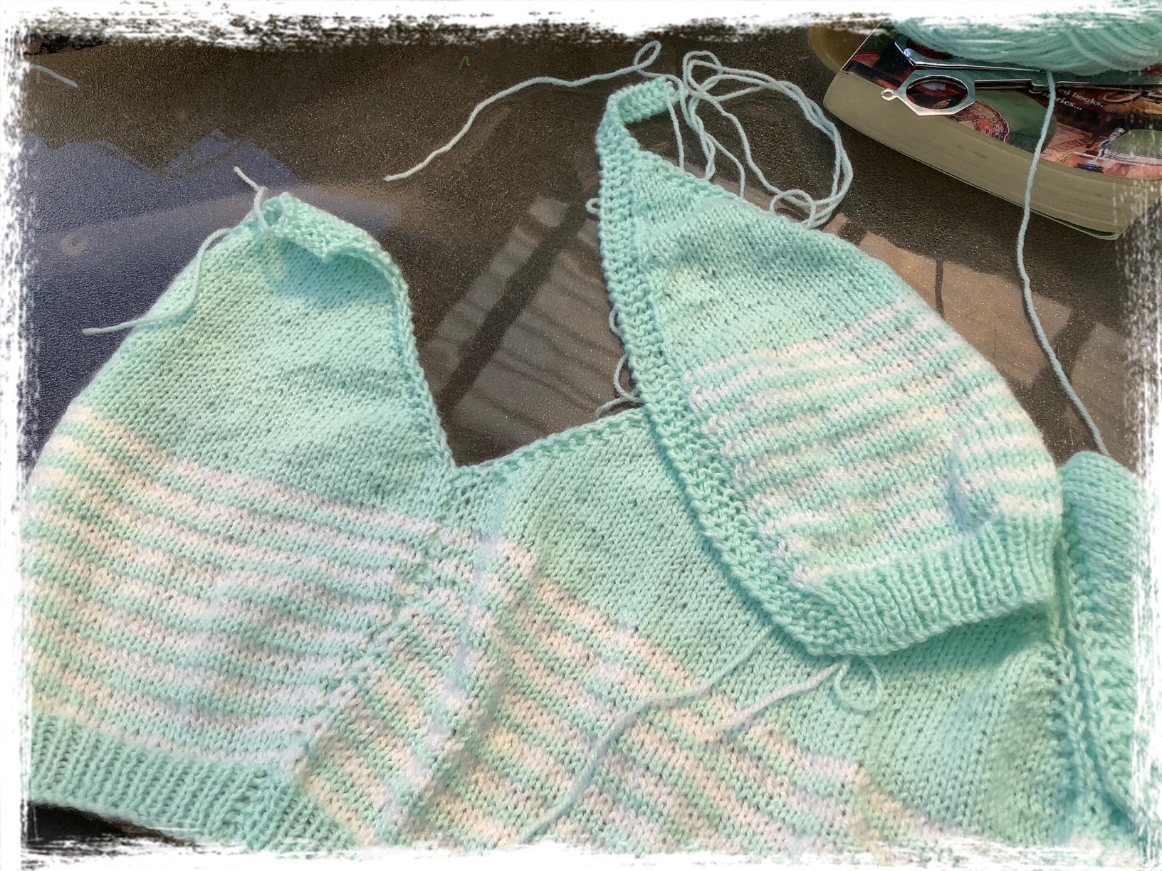 And then there was the embarrassment (annoyance more like) of discovering after sewing two ‘side seams’ I’d actually sewn a sleeve to the back of a little cardigan…..something I don’t ever remember doing before. I did wonder why there were more rows of green above the last white stripe but thought …..maybe I’d miscounted the rows and knit a couple more than needed. Rustle around in the bag for the next piece and out popped the front and not the expected sleeve. Grrr!