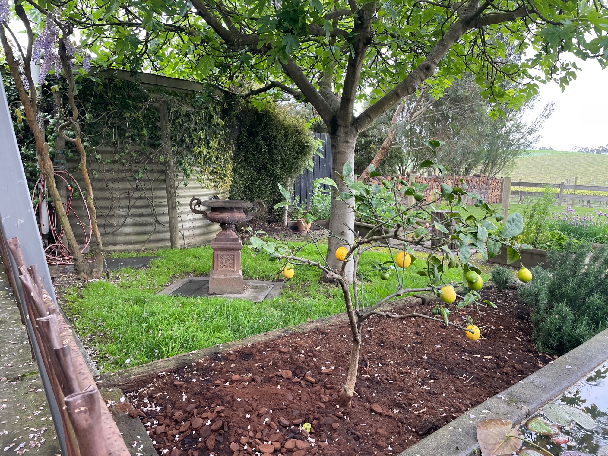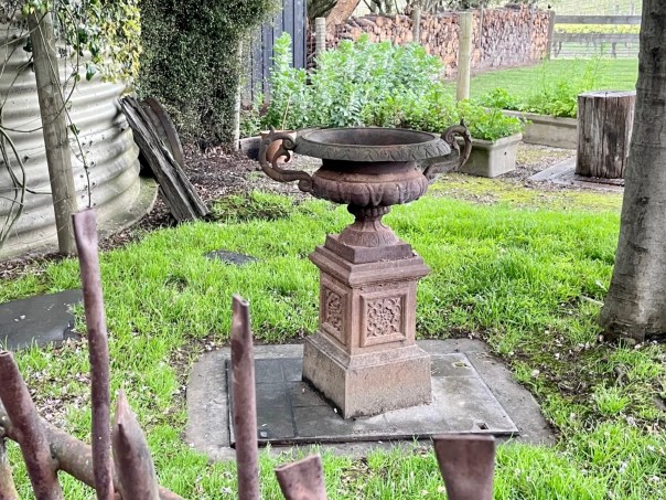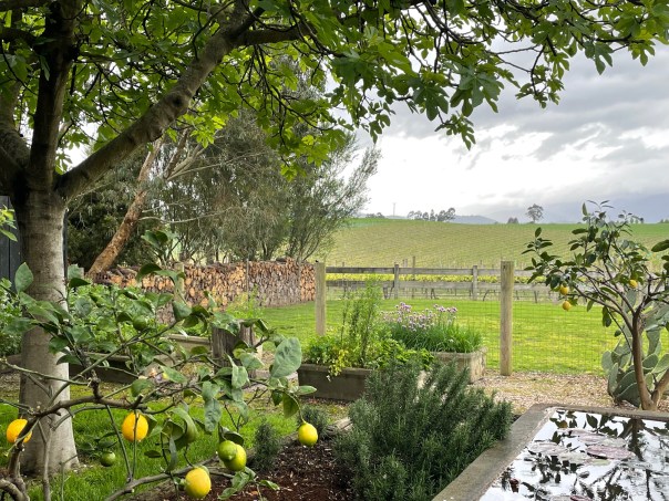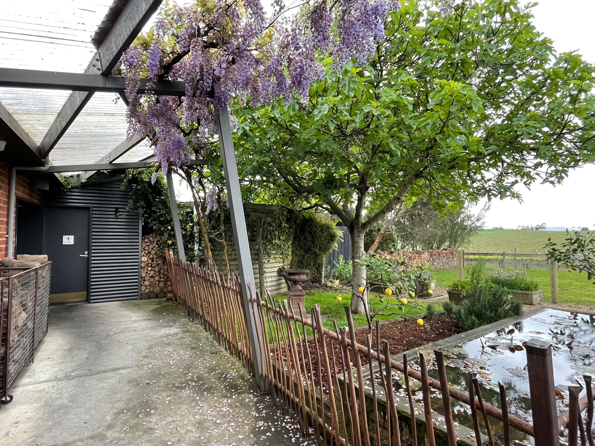 Wisteria hanging from the pergola, a very large garden urn on a pedestal , a dividing wall of logs plus views of the vineyard all help to soften this service area.