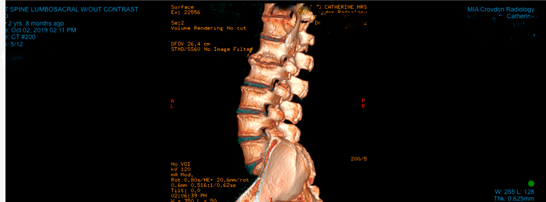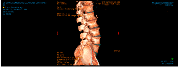 “Catherine’s most recent CT scan does note marked disc space narrowing at the L1/2 level with marginal osteophytes. Spinal stenosis is evident throughout the lumbar spine; severe at the L3/4 and L4/5 levels and moderate at the L2/3 and L5/S1 levels. Facet joint degenerative changes are also present at these levels.”
