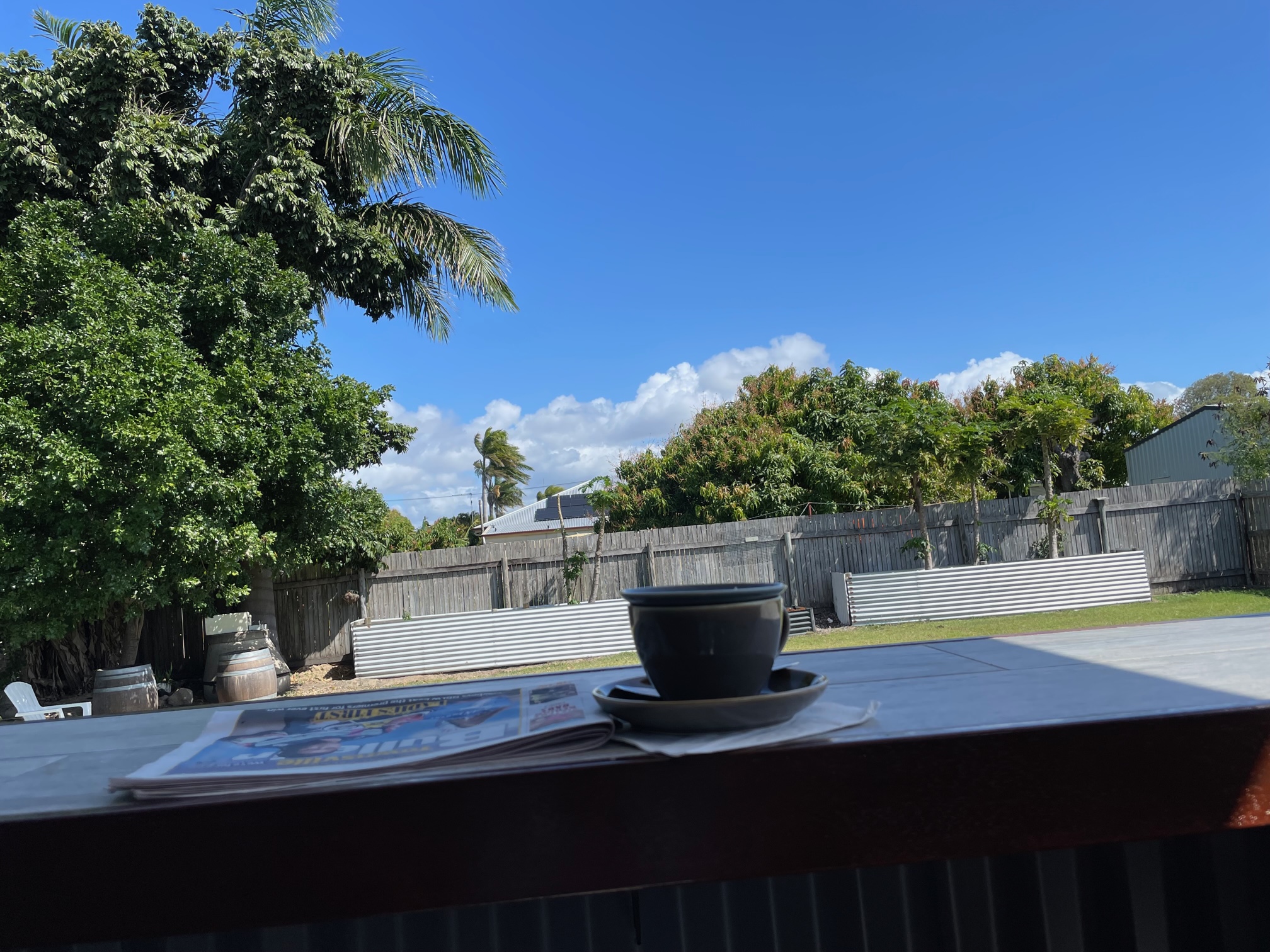 And what was there to do but laugh the day we tried the little coffee shop down the road and it had run out of table space but had room at the outside bar. Now that’s great for those who can clamber up onto high stools – not so for a short legged Catherine having an achy back day. I found a little stool made a great improvised table while The Golfer enjoyed his from up on high
