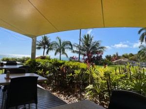 He took me out to lunch at The Cove – a special spot with its green tropical garden plus sea views. Lightly booked that day but because it was very warm we decided to sit ‘inside’ under cover. But look, inside or out the food tastes just as good.