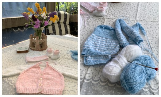 I’m not a top down knitter, prefer straight needles making garments in pieces rather than in the round. And because I’ve knit these little basic cardigans so often over the years I’ve simplified the instructions – instead of ins/cms I use rows. So that side seam for both fronts & back will equal 42 rows – 10 rib plus 32 with cast off for armholes on row 43/44.