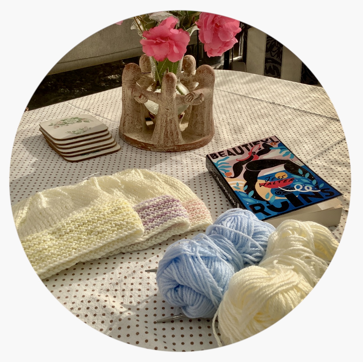 I’m sure (well, more like hoping) that if I keep plodding along making these simple, easy to knit baby hats that maternity wards like for newborns, one day I’ll find my box of white, cream and pale coloured oddments is empty – still got a long way to go before that happens tho’