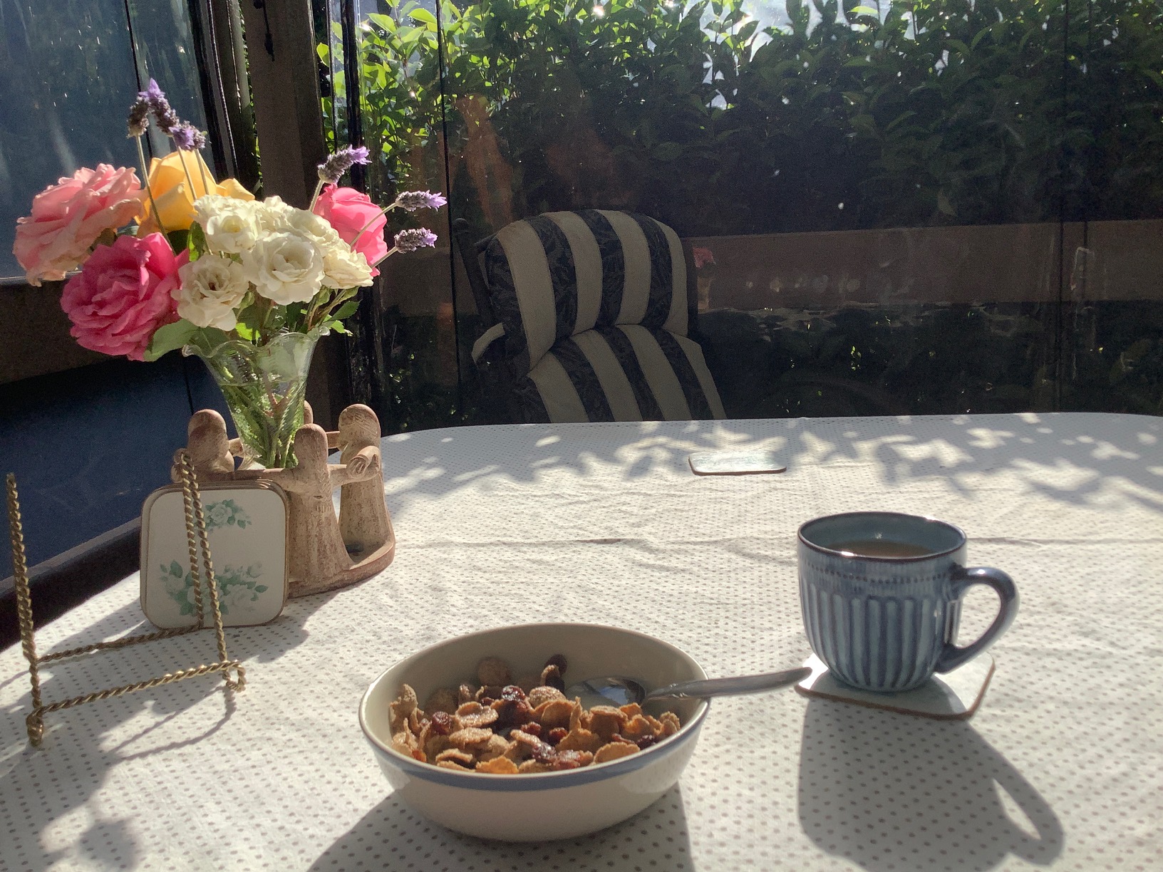 Spring seems to have finally got the message so having some bright sunny (not too cool) mornings early last week meant I could breakfast outside (a very simple one this particular day). A quiet time that sets me up for the day- no tv or radio – just me, myself and I plus a book or maybe some birdsong if I’m lucky…..one that definitely brings a smile to my face.