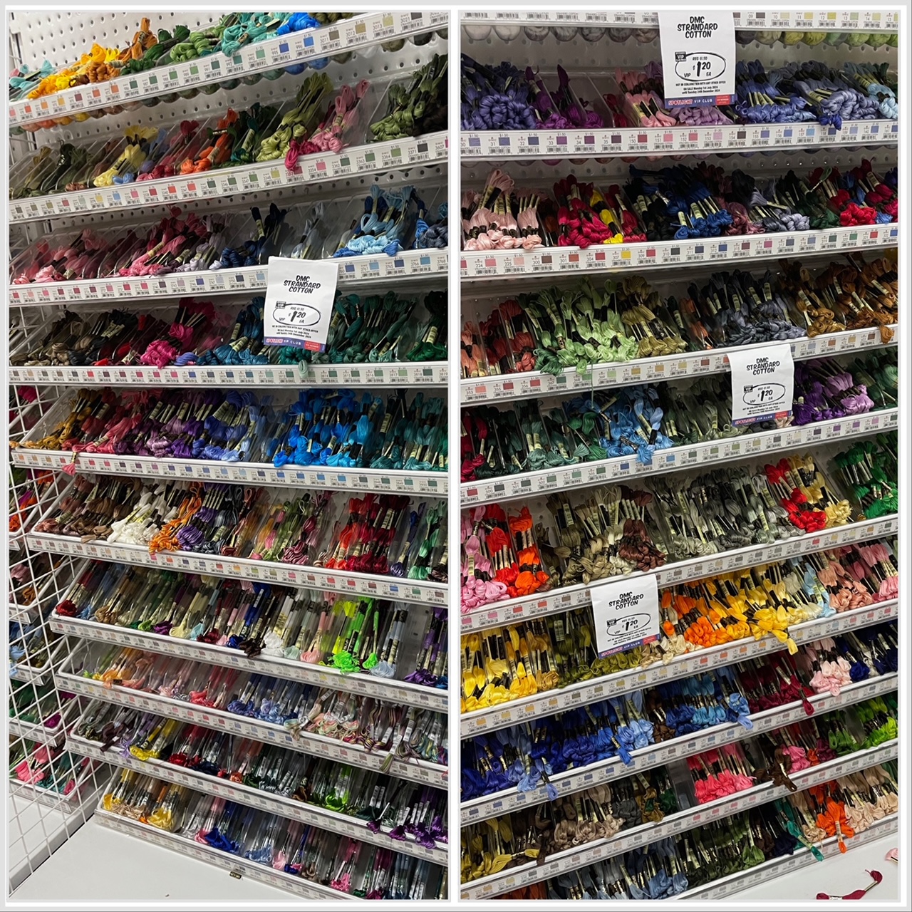 I’d gone looking for an ‘easy to see colour’ so wasn’t bothered by the numbers. But let’s just say it was good job that what I was looking for wasn’t on the bottom ground floor section. I’d have been looking for someone to pick it out/pick it up for me. It was a long way down with shade numbers not exactly visible! Spotlight must think embroiderers are all young and nimble