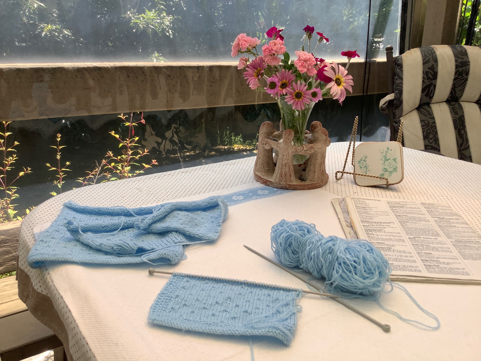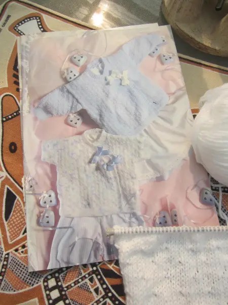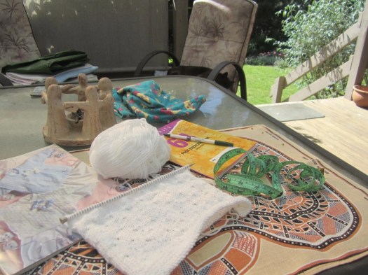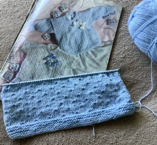 So in a bid to do something different that didn’t require me to concentrate – backstitching on the baby sampler is driving me potty – I’ve picked up the little blue cardigan I was experimenting with up Bowen. Remind me how I prefer knitting with 8ply because this fine yarn is also driving me potty – the feel is entirely different to how I remember it…..and it keeps sliding off the needles …..but as I said, as long as I don’t forget when (and where) to do the purl stitch it’s a change. The back and both sleeves are done, two fronts to go, so it’s three fifths – 60% finished….not counting making up and finding a suitable button