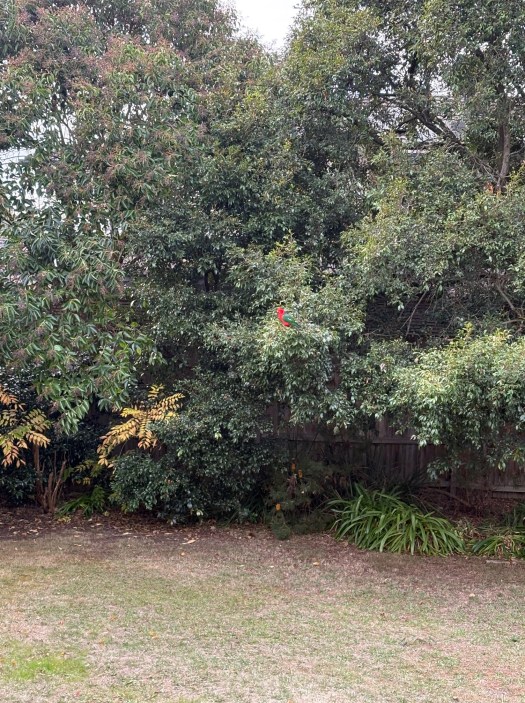 Like the change in season bringing these colourful parrots into the garden. Trouble is they like the Lilly Pilly – the one at the bottom of the garden (at least 20m/65’ away) – but never stay still, flitting around in amongst the leaves and branches trying to find the ‘best berries’ ……then as soon as I start move down off the deck to get closer they’re off and away.