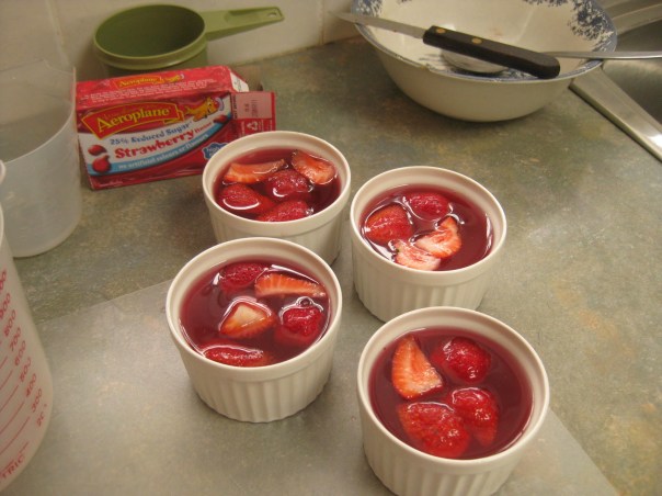 When the children were little I’d often add a tin of mandarin oranges which seemed to stretch it a bit further – we happened to have strawberries on hand the other day So I chopped up a few and added them to the red jelly mix (Our fridge lives in the laundry which means the washing machine is close by A flat lid plus a clear chopping board makes a great handy bench at times)