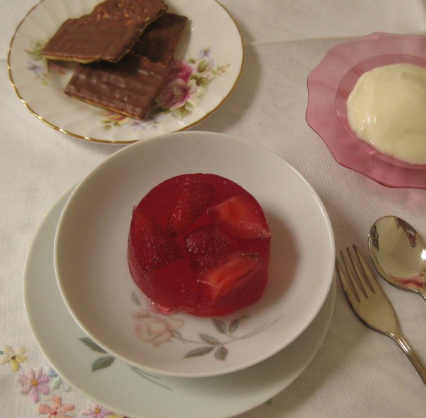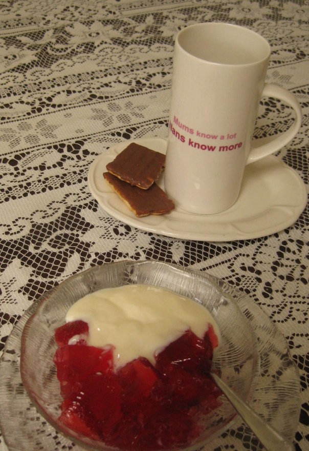 So simple to make – dissolve in boiling water – add some cold then pop in fridge to set Takes no effort to eat – it just slides down the throat Just the thing when you are feeling unwell Lovely and cold when your body is hot Fabulous with Ice Cream or Yoghurt Along with Fruit and Custard and Cake (of some sort) you have the makings of a Trifle.