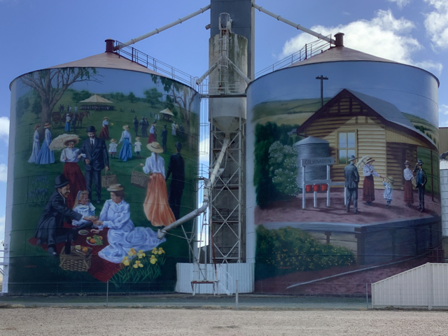 Mural in Bowen Far North Queensland showing early settlers. Painted silos Colbinnabin Northern Victoria showing early settlers