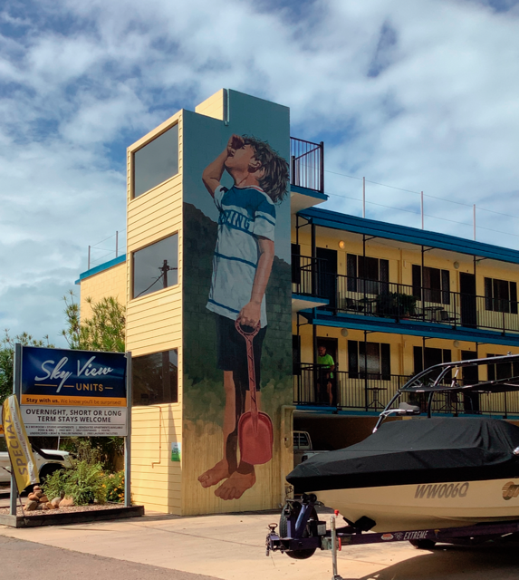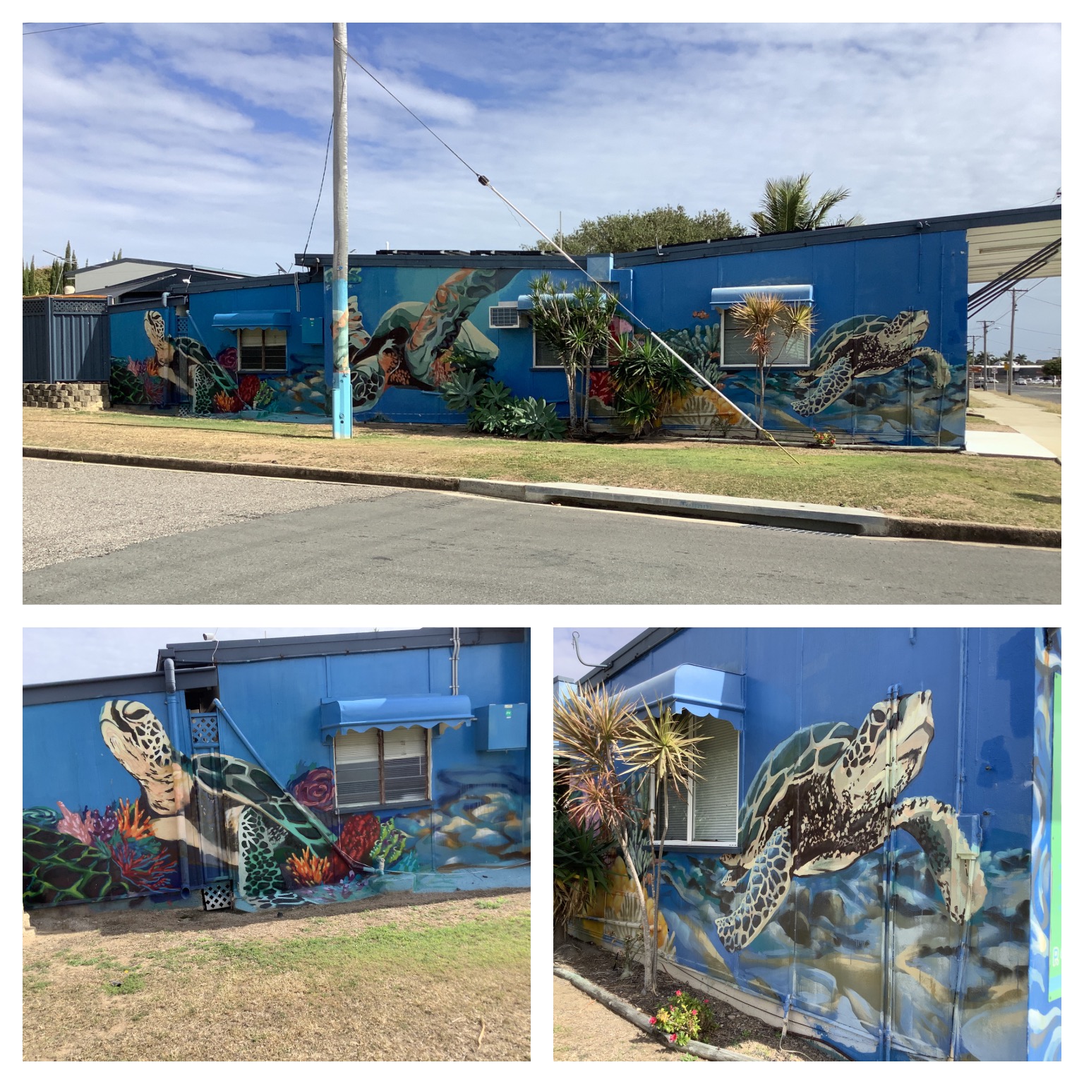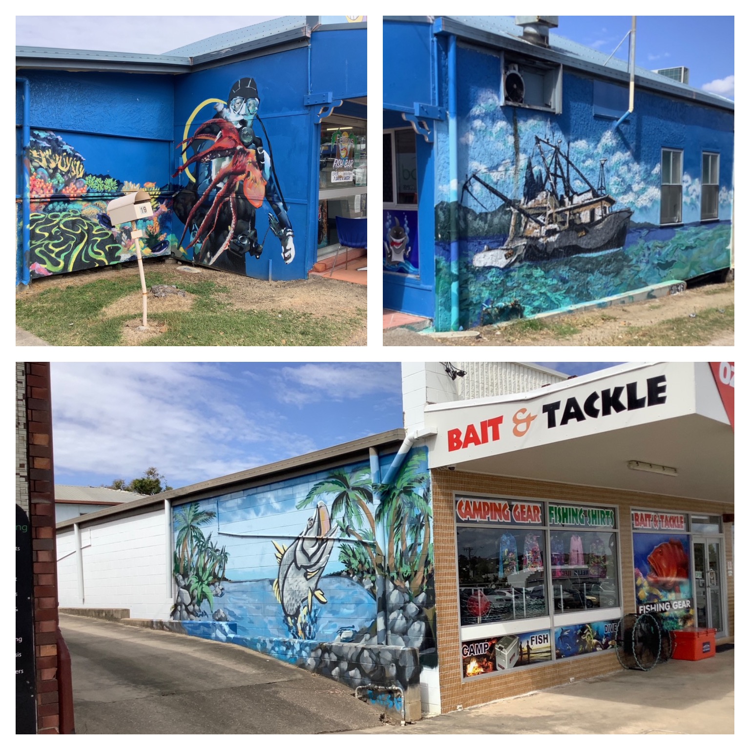 So it was off to town to find some newish murals I’d seen around and about…..actually I’d noticed a few of them when we were last here but never got round to taking photos. James Ellis – a young mural artist from Brisbane, came up here in 2017 (plus a few years since) and has put a lick of paint on some shop premises and other places, same as he has been doing all over Queensland.