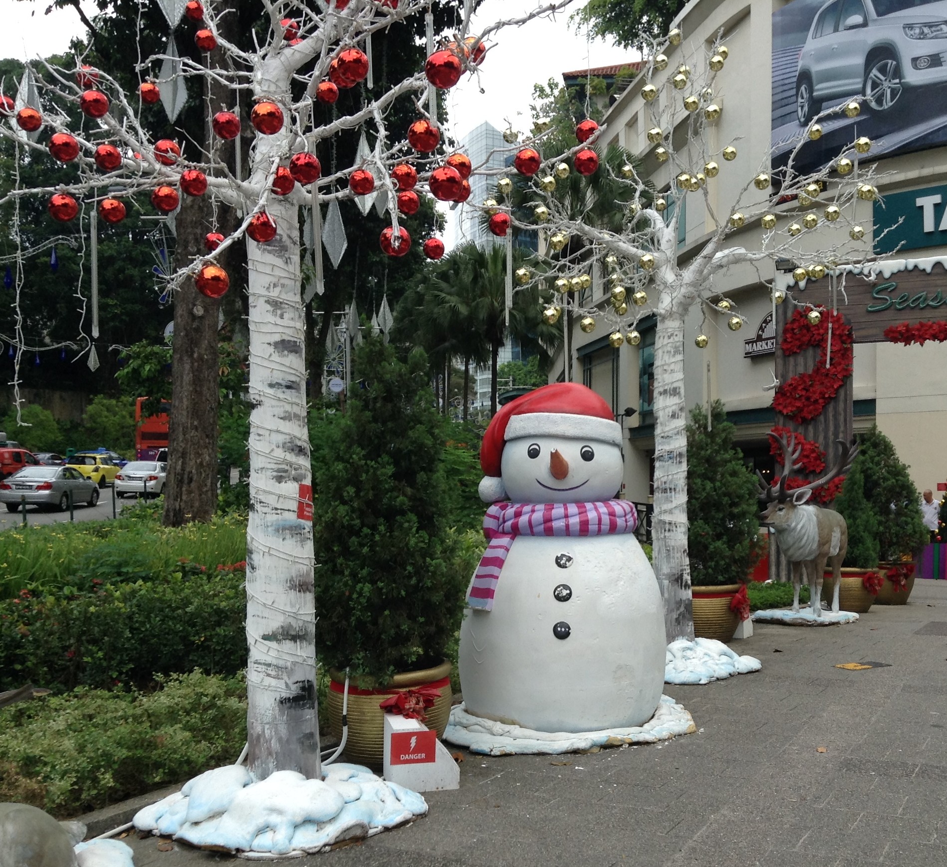 Can you imagine our surprise coming across these – a red hatted snowman plus a very jolly red suited Santa and his very horsy looking reindeer, when we were in hot steamy Singapore one December 🙂