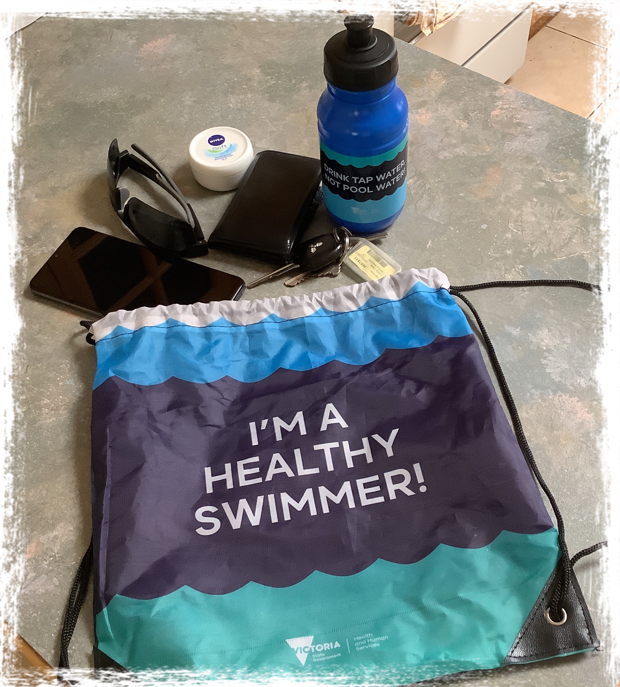 Now I have a neat little bag (plus accompanying water bottle, remainders from a promotion geared towards school children) large enough to comfortably take car keys, phone, wallet, (face cream) and sunnies as well. No more scrabbling around trying to locate things at the bottom of a bag containing soggy wet things. Love it ! 🏊♀️🏊♀️🏊♀️